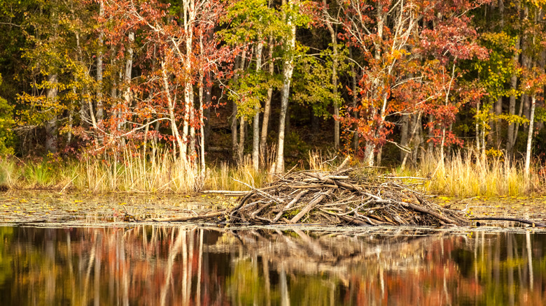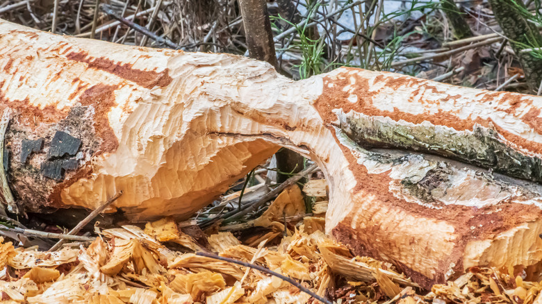 While bare trees are a sure indicator of a beaver's presence, other signs provide clues that a beaver is at work. In search of the right materials for a den, a beaver may extend beyond the forest and "borrow" materials nearby, such as the wood pile in a neighbor's yard. Gnaw marks on the logs are signs that the beaver is looking to reinforce its den by gathering as much wood as possible. Evidence of beaver activity can also appear inside a drainage culvert that is built under a road. In its earnest desire to block any running water, the animal will fill the culvert with mud and sticks, which will often cause the water to rise and flood the road above it. The beaver's instinct to use natural materials to alter its environment is why It lives up to its reputation as nature's engineer.