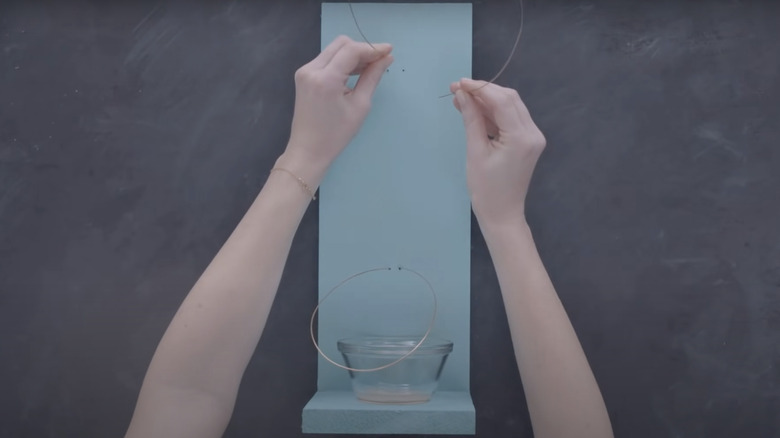 About a quarter of the way down the feeder, drill two holes large enough to feed your wire through. Drill another two holes about three quarters of the way down the back. Thread the wire through these holes to make a pair of loops coming off of the back of the feeder, hanging over the base. Then, you can slide your wine bottle through the loops, until the mouth is just inside your bowl. Secure the bottle by tightening the wire loops, twisting them behind the back of the feeder.