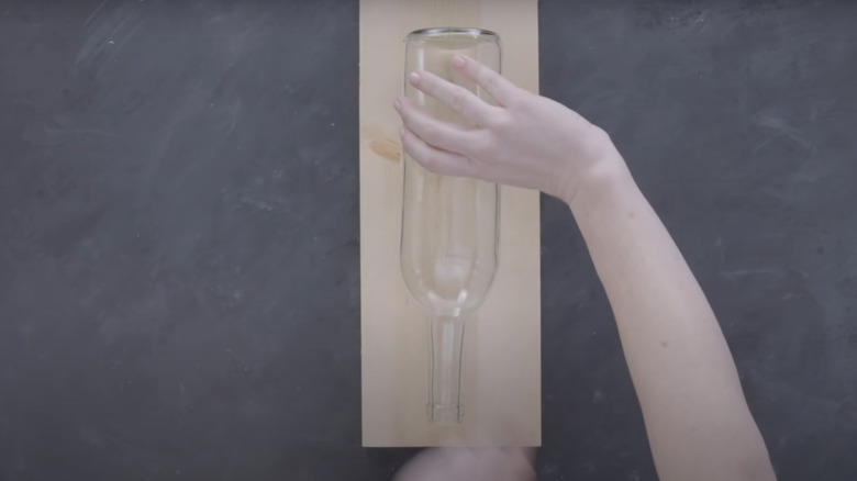 You can make these feeders using any size and shape bottle as long as you ensure that you cut the wood to the correct size to accommodate it. As demonstrated by HGTV Handmade, for a standard wine bottle, cut one piece of wood to 14.25" X 5.5". This will be the back of your feeder. To make the base, cut another to 5.5" X 5.2". Then, align the base at a 90° angle and secure it with wood glue. After it dries, you should secure it with L-brackets, since it will have to hold up to the elements for years to come. If you would like to have your bird feeder painted, you should do so now.
