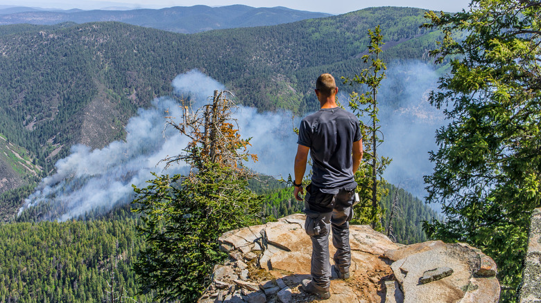The summer and fall seasons are a beautiful time of year to go for a hike, with warmer temperatures and less chance of snow accumulation at higher altitudes. This time of year also coincides with what has traditionally been referred to as "fire season," when many wildfires take place in drier climates. In recent years, fire season has started to extend beyond these warmer months, and wildfires are now being battled throughout the rest of the year. As these events take place, it's become more important than ever to have a plan in place to prepare for the possibility of encountering wildfire smoke on a hike. This plan should include packing the right gear, understanding the landscape and how fire travels, and being flexible with your plans.