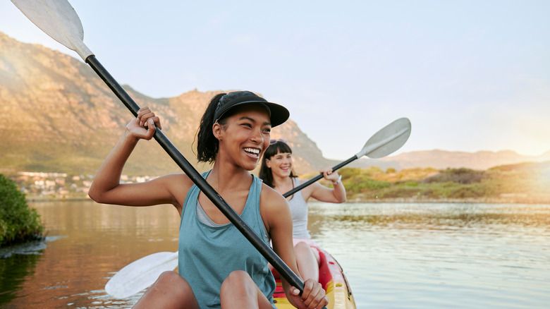 Because floating out on a crystal clear lake looks so leisurely and relaxing, many people forget that kayaking can be a strenuous full-body workout. Because of this, just as if you were going on a long hike, you will need to bring plenty of water, food, and sunscreen for your kayaking journey. It's easy to forget to stay hydrated while kayaking because you are likely thinking about other things. However, it is recommended that everyone drinks at least five to eight ounces of water every 15 to 20 minutes while out on the water.
