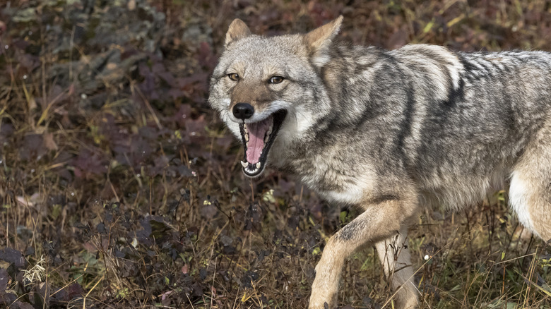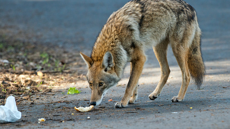 As described by The Humane Society, coyotes that are habituated to humans will not run away. This is dangerous for coyotes, pets, and humans, especially children. A process called hazing is used to get coyotes out of populated areas and help keep them wild. Your first move should be to wave your hands over your head and shout. If it doesn't leave or runs a short distance and then looks back, you should approach, continuing to shout. If it still does not leave, you may need to stomp, spray it with water, or toss something harmless, like a stick, in its direction. Hazing a coyote may seem mean, but teaching them that humans are safe to approach and interact with is worse.
