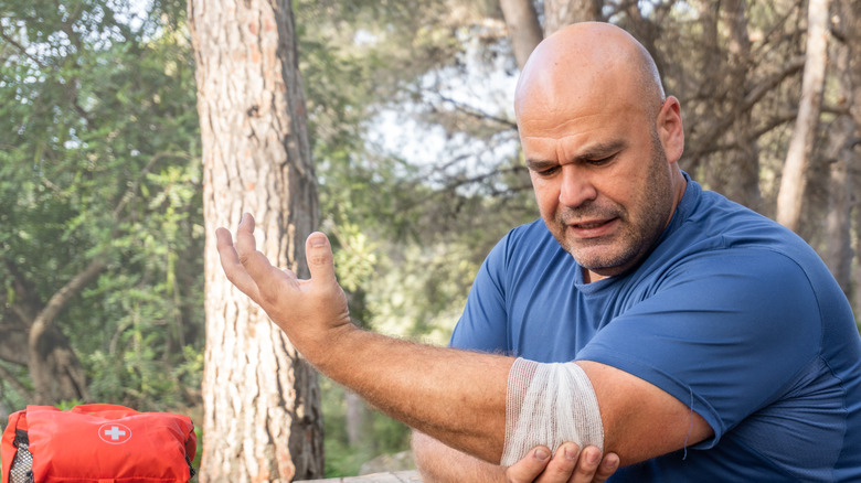 Cuts and scrapes are a common part of hiking, as you brush against rocks and tree limbs, or when you prepare meals with a sharp knife. If you cut yourself on your hike, your first concern is to stop the bleeding. Apply pressure with a gauze bandage, and elevate the injured area above your heart. Once the bleeding has subsided, irrigate the wound using the spout of your clean drinking water, then clean the surrounding area with an antiseptic wipe. Apply antibiotic cream and a bandage, and pay close attention to any signs of infection over the next 24-48 hours. These symptoms can include skin that looks red and feels hot, and you might see red streaks appear alongside the wound. If these conditions develop, it's important to seek medical help as soon as possible.