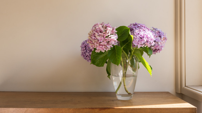 The same Redditor also recommended soaking the entire flower — stem and all — in water before cutting and dipping it in alum. This works especially well to freshen up store-bought hydrangeas because hydrangeas can also drink water through their flowers and petals as well as through their cut stems. So, soaking the whole flowers in a bath of cool water once you get inside from the garden or back from the store is a great way to liven them up before cutting them, dipping them in alum, and arranging them in a vase.