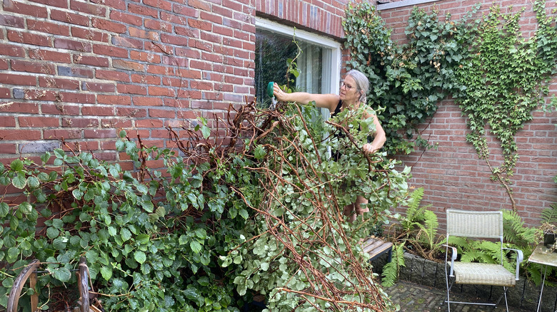 With its cascading vines and lush, evergreen leaves, English ivy (Hedera helix) is often chosen for its aesthetic appeal and ability to create a charming, natural backdrop. However, it is also known for its aggressive and invasive nature (via Royal Horticultural Society). Its vines can spread rapidly, climbing and covering structures, trees, and even the ground. This invasive behavior can lead to the displacement of native vegetation and may pose a threat to the health of established trees. The adhesive roots of English ivy enable it to cling to various surfaces, including buildings and walls. The persistent growth can lead to structural damage as it can even penetrate small openings, causing cracks and creating maintenance challenges.