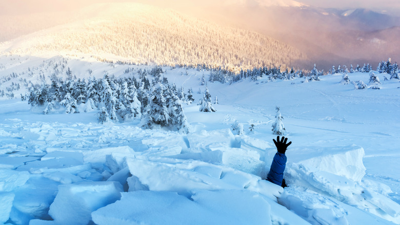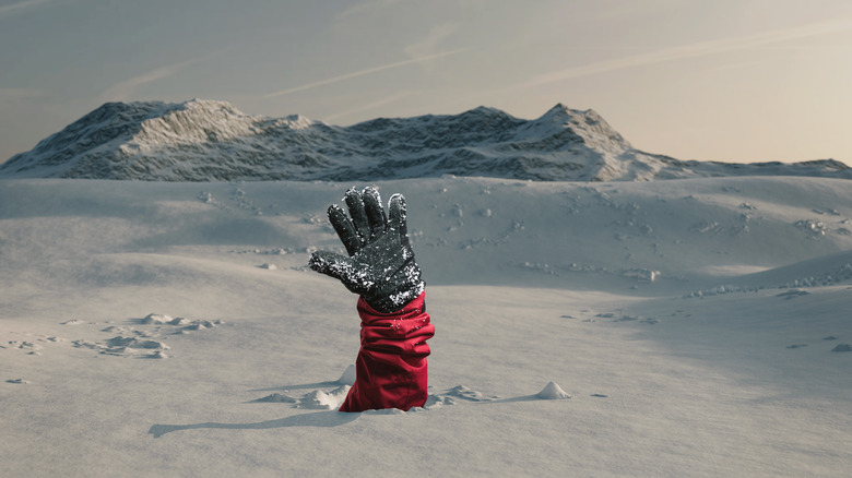 Creating an air pocket in front of your face may only be effective in a mild avalanche, but if time allows, an attempt should be made. Over 85% of avalanche deaths are due to asphyxiation, (via The National Library of Medicine). As the avalanche begins to slow, create an open space in front of your mouth for breathing. This will slow the buildup of carbon dioxide as you breathe under the snow. Raise one hand in the air, above the surface of the snow to let rescue teams know your location. This will hopefully get you removed from the snow much quicker.