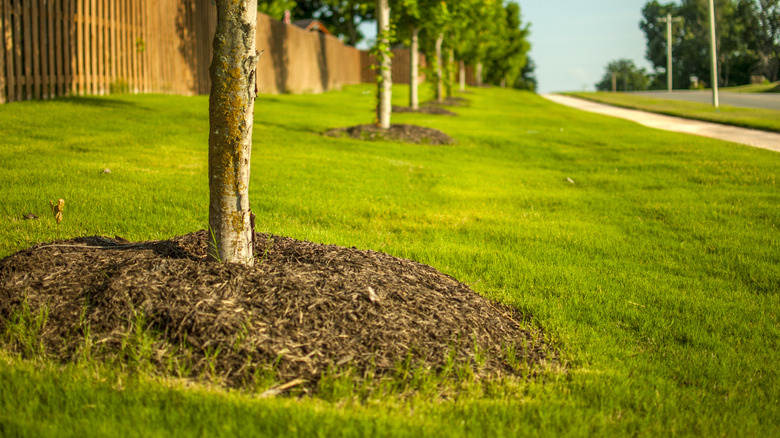 While mulch is important for most young planted trees, it is especially important for fall-planted trees which will better endure the colder temperatures with a layer of mulch to keep the soil moist and the roots warm. The layer of mulch should be about three inches thick but should not be touching the trunk of the tree as this can cause moisture build-up and rot.