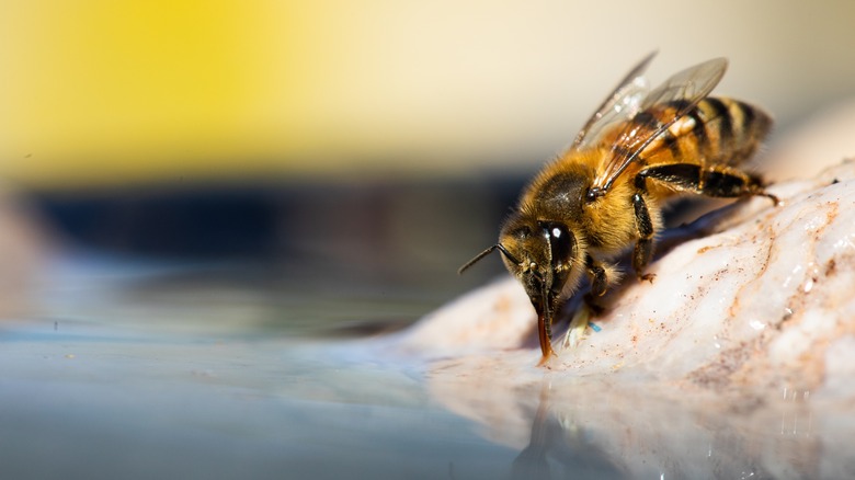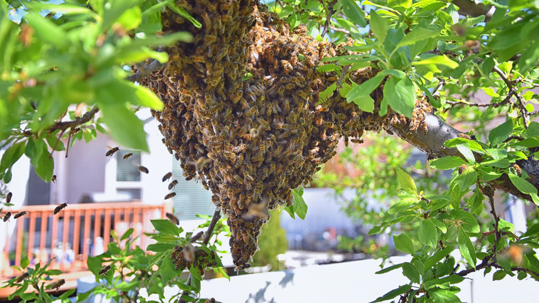 Seeking refuge indoors is your best course of action. Once inside, bolt your doors fast and cover yourself with thick blankets or sheets to shield yourself from any bees that may have followed. Stay under until you don't hear any more buzzing and know for certain that you are safe. If you cannot reach shelter indoors, look for other buildings or nearby vehicles that you are allowed to enter. Even thick bushes, shrubs, or tall grass can make it harder for the bees to track you if there is greenspace nearby. If none of these options are viable, keep running.