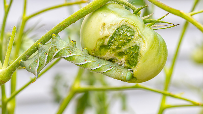Hornworms aren't technically worms but caterpillars that later develop into large hawk moths (sometimes called sphinx or hummingbird moths). These moths are beneficial native pollinators. However, despite being great as adults, you probably don't want to see hornworms in your garden because they have a hankering for tomatoes and will eat all the foliage — and sometimes even the unripe fruits — off of your plants. While hornworms are quite large (growing up to four inches), they can be surprisingly hard to see with their well-camouflaged bright green bodies.