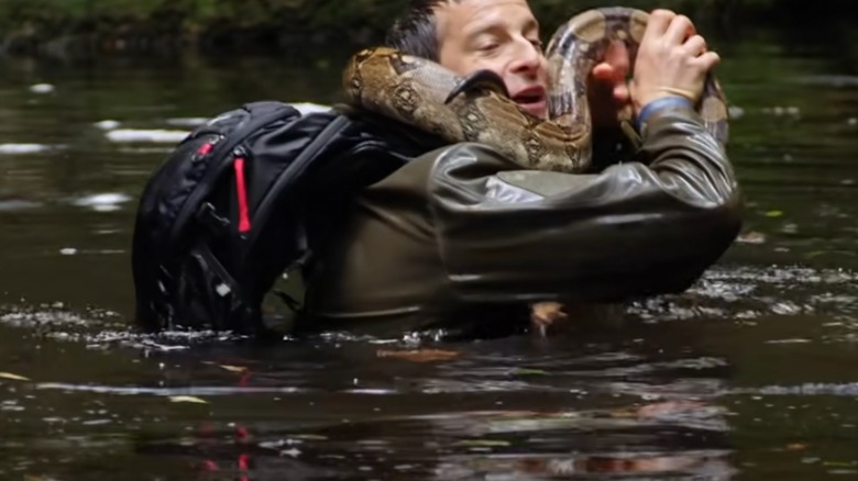 Bear Grylls, the British paratrooper turned TV survivalist, is famous for many reasons but one of the main ones is his willingness to put himself in uncomfortable — and sometimes even dangerous — situations for viewer entertainment. While this all started on his first hit show "Man vs Wild" (which ended in 2012 due to a contract dispute between Grylls and Discovery), it seems to have continued now that Grylls has begun working for the streaming giant, Netflix. In fact, it was during filming for Netflix's choose-your-own-adventure show "Animals on the Loose" that Grylls had the most terrifying experience of his entire career — being strangled by a boa constrictor.