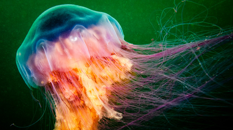 The long tentacles of a lion's mane jellyfish are lined with stinging cells that, when in use, will paralyze prey. The prey then gets scooped up and consumed by the jellyfish. When in contact with a person, the tentacles can leave behind a powerful sting and a nasty welt on the skin. The venom isn't potent enough to cause any real damage to a person unless they get caught up in the mane while underwater. Much like the venom of a stingray, the lion's mane venom can be drawn out with hot water.