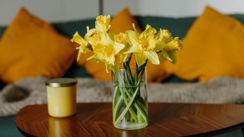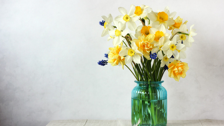 While this method will help your flower arrangement live longer, the other flowers will still likely die slightly earlier than they would without their toxic vase companions. To prevent this, you can also add a special bulb-cut flower food to make the water safer for other flowers. Another option is to pair your daffodils with irises as — interestingly enough — daffodils have the opposite effect on irises and can actually prolong their vase life instead of shortening it. Lastly, you can always keep your daffodils in a vase alone or with other daffodils, but that's just not as much fun!