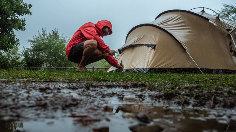 While gazebos are handy, they do have their faults. During heavy rains, it isn't uncommon for the top of the gazebo to pool with water. This happens when the weight of excess rainwater creates depressions or sags in the gazebo fabric, allowing water to accumulate on top. With enough water, the gazebo might come down entirely — an incredibly difficult situation to deal with, especially if you are camping alone.