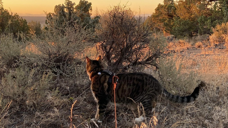 Once your cat is used to wearing a harness and being on a leash, you can start venturing outdoors. Because cats can be a little uncertain about new places and experiences, it's a good idea to start slow. First, take your cat for a leashed walk around your yard. Let them explore and sniff where they see fit as they get used to being outside.