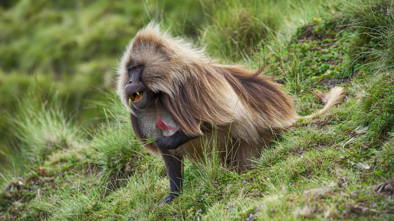 Like the bald uakari, the gelada is one of the world's more visually unique monkeys. With a flowing mane of hair like that of a lion and the bright red, hourglass markings on their broad chests, geladas have a stately yet beast-like appearance. Add their gleaming red eyes and enormous canines to the mix, and you have one of the more intimidating-looking monkeys on the planet.