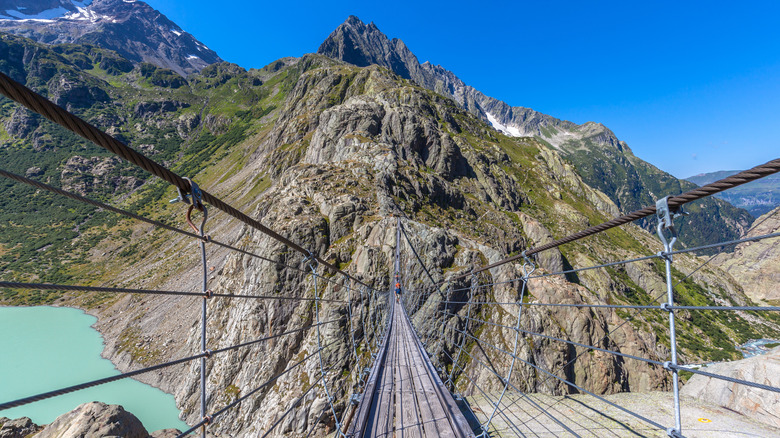 At 330 feet high and 560 feet long, Trift Bridge is not recommended for anyone with even the slightest fear of heights (via Afar). This is where Alpine hiking skills come into sharp focus. The bridge is slim, only wide enough for one person, and crosses over a deep gorge with a rapid, flowing river at the bottom. The bridge is relatively easy to cross when the weather is fair. However, things can get treacherous quickly.