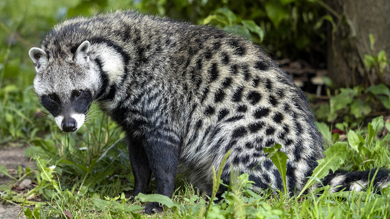 The African civet is reminiscent of the North American raccoon, its fur lined with irregular black, gray and/or white markings. Civets are primarily solitary creatures, so marking their territory is an important adaptive behavior for this species. They accomplish this via odor and scent glands that are situation on various parts of their bodies, including and around their tail and feet. These glands emit strong odors that are distinct to each civet, creating a potent olfactory signature than cab ne detected by other civets in the vicinity. This cautions other civets from encroaching, or, during the mating season, has the opposite effect and invites potential mates in.