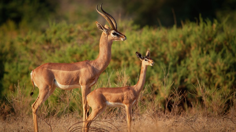 The gerenuk is an animal belonging to the antelope species found in the arid bushlands and scrub forests of East Africa, where it is most often seen in safaris around Kenya. It sports a slender body and tall legs, rendering it capable of reaching speeds of up to 40 miles per hour. It also dons a long neck, which allows it to reach heights that other herbivores cannot reach, making it a master of foraging on high branches and foliage. These traits have earned it the nickname "giraffe gazelle" in English.
