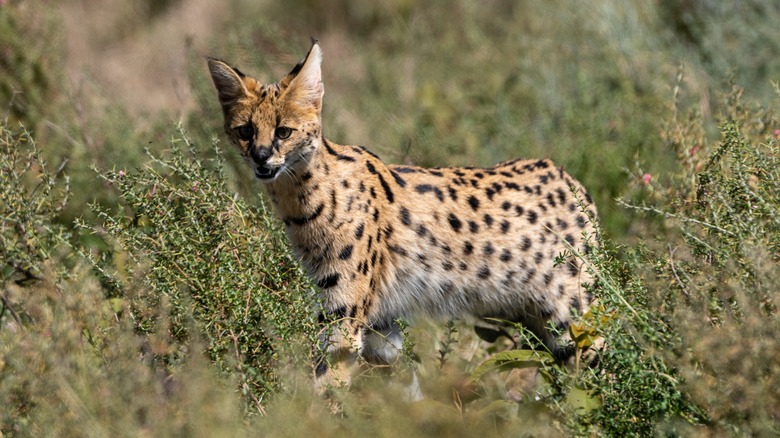 The African serval (Leptailurus serval) is a feline inhabitant native to the savannahs and grasslands of Africa, primarily south of the Sahara Desert. It is considered a medium-sized cat, with adults weighing between 20 and 40 pounds and standing anywhere between 32 and 40 inches tall. Most serval cats don yellow-brownish fur adorned with striking blacks stripes on their heads. These stripes often break into spots further down on the serval's bodies, adding a layer of depth to the serval's appearance. Interestingly, in the mountains of Kenya, servals sport an all-black coat. But the best place to see this feline is in the Serengeti.