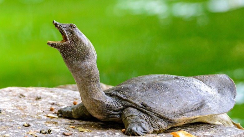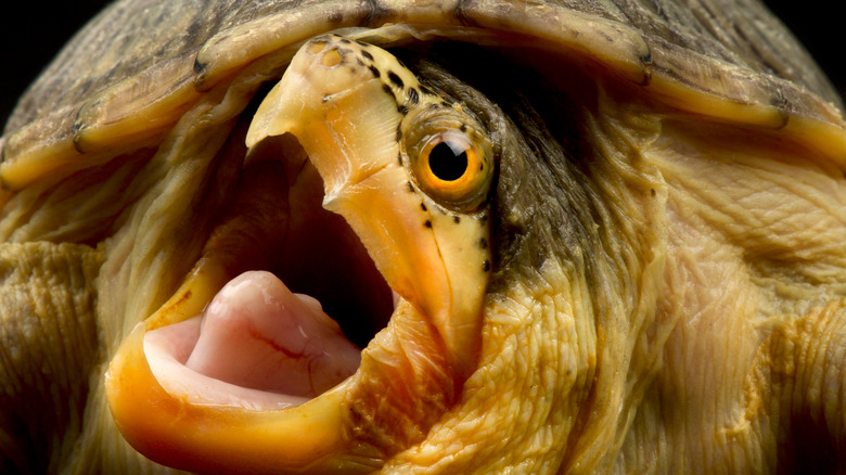 The softshell turtle is one of the only turtles that possess a jaw instead of a beak. Its small head comes to a point where the lower jaw meets an elongated nose, making it look as though this turtle is puckering its lips for a kiss. Kissing is the last thing you'd want to do with any turtle, especially this one. Though it doesn't have a sharp beak to penetrate your skin, the bite of a softshell turtle is one of the most painful and powerful you will encounter.