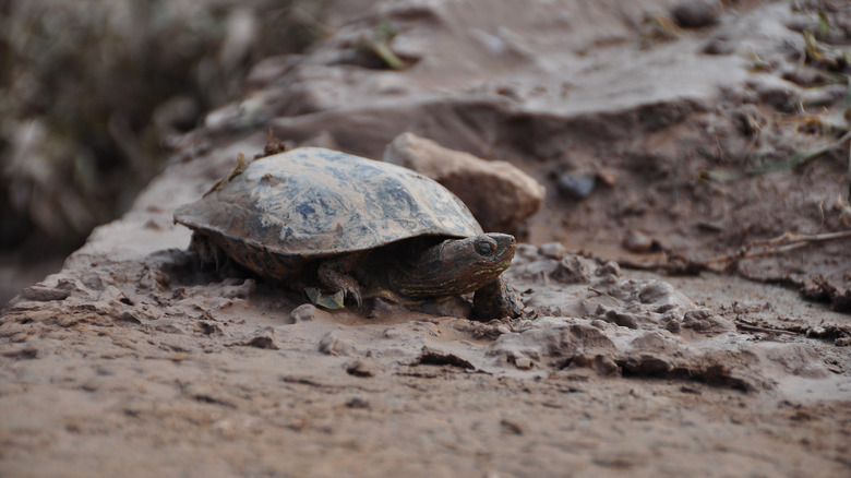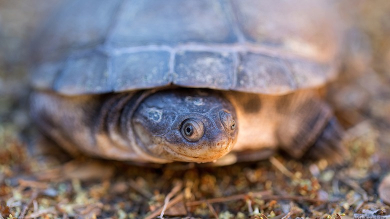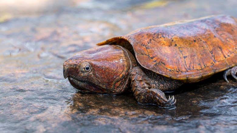 These creatures are called mud turtles for a reason. One of the few species of turtle that prefers wallowing in warm mud puddles instead of coming out in the sun to bask, the mud turtle is an expert at swamp camouflage. Like its cousin, the map turtle, the mud turtle has a uniquely patterned shell. While mud turtles do not have sharp ridges rising along the crest of their shell, they do have exceptionally powerful beaks
