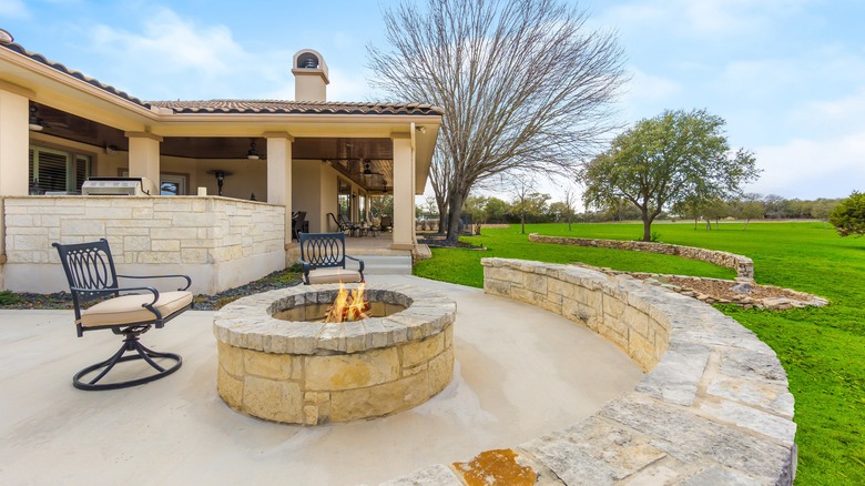 Patios are made from a wide range of materials. Wood can be used, but since patios are ground level, more water-resistant materials are typically favored. Concrete, which can be poured into essentially any size and shape, is one of the most common, although it tends to lack the aesthetic appeal of other materials. As a result, it is becoming increasingly common to utilize materials such as natural stone, brick, and pavers to add style and create ambiance. It is also becoming popular to add other design elements, such as a fire pit, to patios.