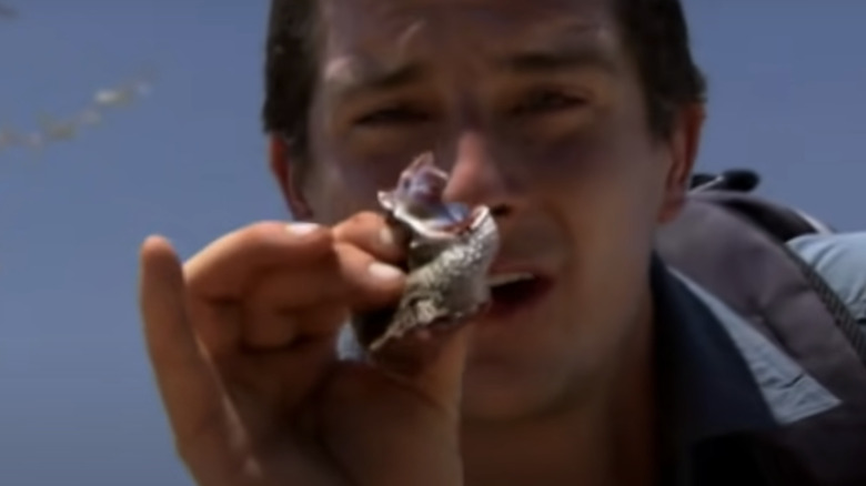 Grylls would eventually repent and reveal he regrets killing so many snakes in the show, but one might argue that if you kill a snake with the methods he outlined here, it's fair game. During this particular brush with the bush, Grylls learned about an Aboriginal folklore method of killing snakes that involves sticking the live snake's head directly into his mouth and biting it off. Lest we forget, Grylls is learning all this while the angry snake is hissing in his grasp. After "some smart alec" on the crew basically told Grylls to do it because it would be "pretty awesome," he opened wide and bit down on a live snake.
