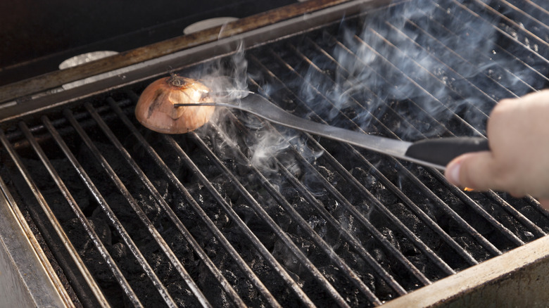 So, what can you use instead? There's always the boring choice of reaching for a wet rag to wipe down your grill grate. However, if you want to have a little more fun and add some flavor to your food at the same time, you can reach for one common kitchen staple instead: an onion. This works because onions naturally release acidic juices which help get off burnt food scraps and stuck-on grime. Furthermore, onions are naturally antibacterial and are likely better for you than any type of chemical grill cleaner. So, how do you do it?