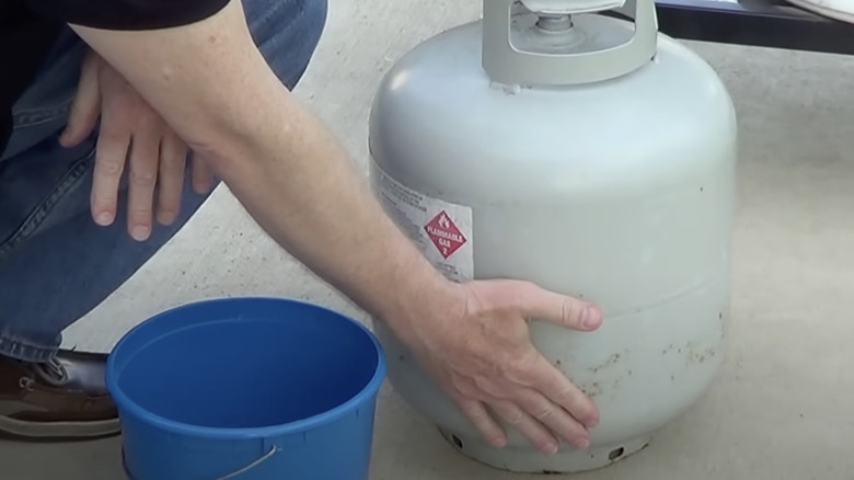 So, now you know how this hack works but how do you do it? To get started, fill up a container with about a quart of hot (or warm) water from your sink. Then, carry the container out to your grill and pour the water over one side of your propane canister. Next, slowly run your hand down the side of the tank where you just poured the water and stop when you feel that the metal is cool. The area on the tank where the metal suddenly changes temperature from warm to cool is the line where the propane tops off.