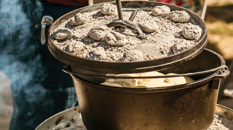 Pros to campfire cooking with a Dutch oven: The advantage to campfire cooking with a Dutch oven is versatility. A Dutch oven can be used as a cast-iron cauldron or pot for boiling. It can be used to bake -– hence the "oven" portion of the name. This is accomplished by setting the oven in a bed of coals, then placing coals atop the oven's lipped lid. This causes it to be heated from above and below –- like an oven. When utilized in this manner, campers can bake meals such as casseroles, desserts such as pies, or any number of biscuits and breads. Finally, a Dutch oven can be used as a cast iron skillet, which allows for the cooking of a variety of camp meals. Dutch ovens can also be used to cook meals capable of serving large crowds.