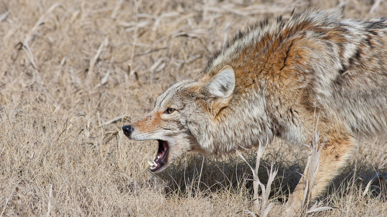 Aggressive coyotes typically aren't scared off by hazing tactics and exhibit similar warning signs as domestic dogs — snarling, barking, raising the hair on their back, etc. If a coyote is not showing fear from hazing and/or is acting aggressively, it is best to move away slowly while maintaining eye contact. Give the animal plenty of space and leave the area. If the coyote gets a little too close for comfort, you can use pepper spray (which you should always carry when hiking), throw rocks, or use a stick or branch to shoo it away. Once you have put plenty of distance between yourself and the animal, you should immediately report any encounter with an aggressive coyote to the nearest wildlife authorities.