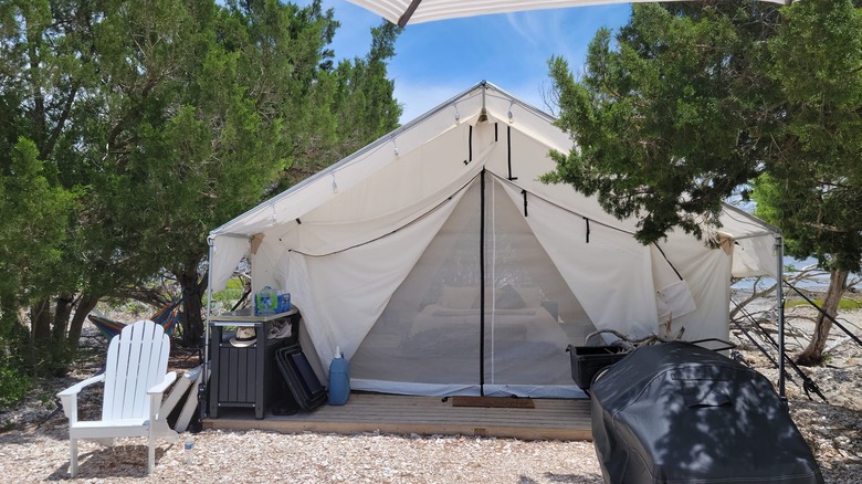 Affixed with a single luxury tent, complete with a memory foam mattress, wood-burning stove, coffee/tea, and plenty of board games, Little Raccoon Key creates a cozy oasis. Outside, you'll find hammocks for snoozing, Adirondack chairs for relaxing, a grill for cooking up food, and an outdoor shower for bathing away the sand you're likely to accumulate.