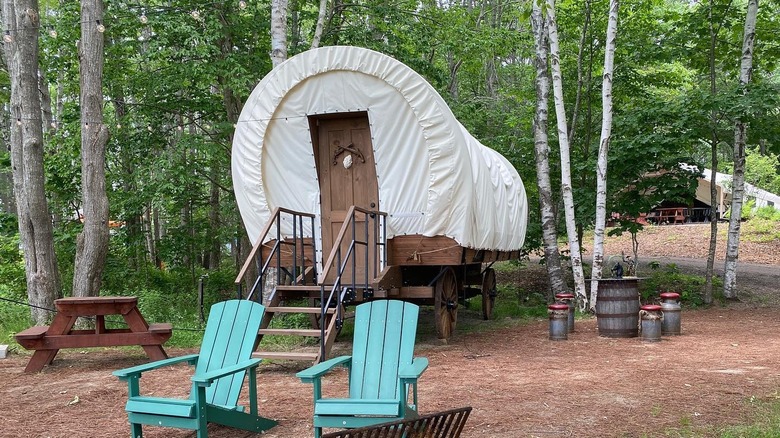 Besides the pioneer wagons, other accommodations include luxury teepees, safari tents, lodge suite, and a one-bedroom cottage. Standard tent camping and RV hookups are also available, but we're really in it for the glamping. Who wouldn't want morning coffee hand delivered to their door via courier? You would, if you stayed here.
