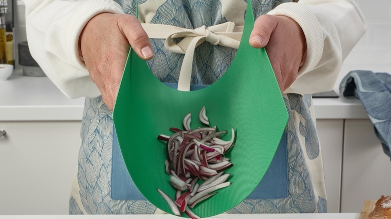 However, their flexibility is what really makes them ideal. They can't fully bend in half, but they can flex and twist enough to fit in a backpack or a cabinet that's a bit too short. Their flexibility also comes with another bonus. After you cut up your food, you can pick up the cutting board and fold it a little in the middle so ingredients slide right down the board and into your cooking pot without spilling.