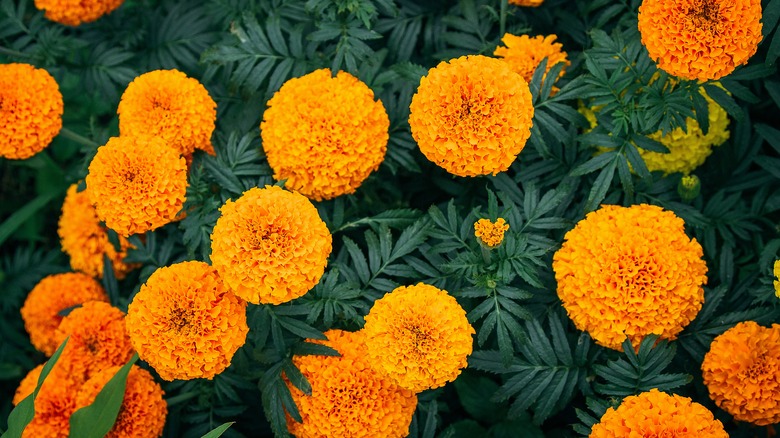One way that marigolds are said to keep a garden safe from pests is by covering up the smell of vegetables with their strong aroma thereby drawing pests to them instead of your other plants. Although there is no research proving that marigolds help lure away specific pests, most gardeners believe that this trick works with tomato hornworms, cabbage worms, squash bugs, whiteflies, and aphids. Because of this, marigolds are sometimes called a trap crop because they catch annoying pests and keep them away from more valuable veggies. To create a pest trap with marigolds, you can plant rows of marigolds between your vegetables or plant the flowers in a perimeter around your entire garden.