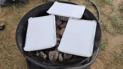 Once I liked the mixture, I put the provided covers over the top of the trays and set it in my fire. If your trays don't come with lids, aluminum foil also works. I set a timer for five minutes and left them alone. As a tip, I live somewhere where fire danger often leads to bans on open flame, but propane fires are usually banned only during very serious fire restrictions.