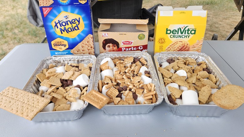 Apparently, I'm not the only one to feel this way. On TikTok, creator @earthtokesh found a way to upgrade s'mores. Dubbed the "Holy grail of camping desserts," this s'mores recipe involves baking s'mores ingredients in a disposable metal tin over your fire. When I go camping, I usually have at least three other people with me, all trying to cram around a small fire to cook marshmallows while taking turns handing out chocolate and graham crackers. Having a way to bake s'mores for everyone all at once sounded like a great idea, and I was really excited to try it and see how it works.