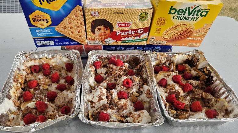 For the most part, I tried to keep the ingredients as similar as possible to the original TikTok video. I went with milk chocolate chips, Ghirardelli, which cost me $5.49 for a standard-sized bag. Though the creator used jumbo marshmallows, I decided to use regular, and I went with Jet Puff, which cost $2.29 for a bag. Two small containers of raspberries cost $7.98. The reusable storage pans were $4.98 for five. Then, you can get Honey Maid graham crackers for $4.68. Additionally, I bought Golden Oat Belvita cookies, which cost $4.68, and Parle-G cookies for $1.38, because I wanted to try out different options. However, you can just pick your favorite and go from there. So, in total, you can get more than enough stuff to make five trays of this s'mores dessert for under $30, and probably under $20 if you go with store-brand items.