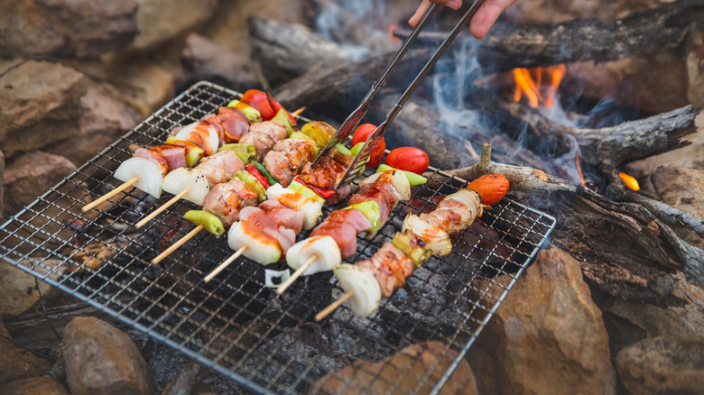 While kebabs are easy to put together ahead of time, you could also do so as easily at the campsite. Take your seasoned chicken, usually breast meat or thighs — and slide them onto wooden skewers, alternating between meat and vegetables until the majority of the stick is covered. Popular seasonings include Italian or Greek dressing, balsamic vinaigrette, buffalo, and teriyaki.