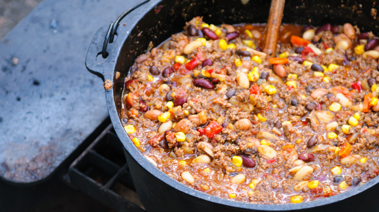 If you're reheating chili that's been frozen in advance of your trip, make sure that you add a little water to the pot. This will prevent the chili from burning as it reconstitutes. Have some shredded cheese and sour cream on hand in the cooler to give that chili a little bit of extra heft.