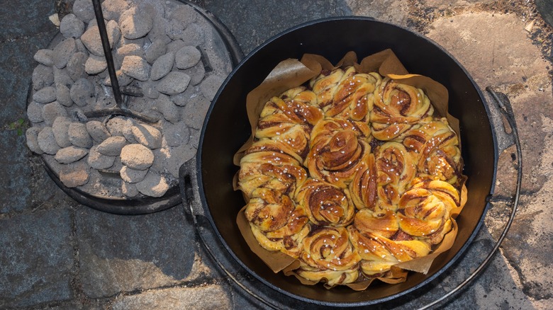 There are several cooking vessels for baking the cinnamon rolls. You could use grilling prongs, a pie dish, a cast iron skillet, or a Dutch oven. It all depends on whether you want to bake them en masse or as their own separate rolls. If you're hoping to make them stretch for a few days, the prongs allow you to cook them individually instead of as a whole.