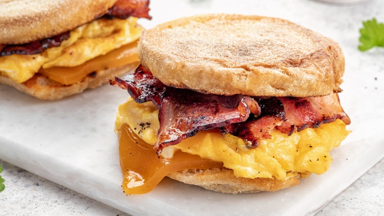The big difference between breakfast burritos and English muffin breakfast sandwiches is that the latter is far simpler when it comes to ingredient requirements. All you need to do is whip up a big batch of eggs in a sheet pan, divide them, and assemble your sandwiches. The only other ingredient that requires cooking is bacon, but breakfast patty sausages and Canadian bacon only need to be warmed up because they already fully cooked.