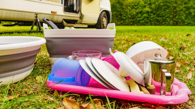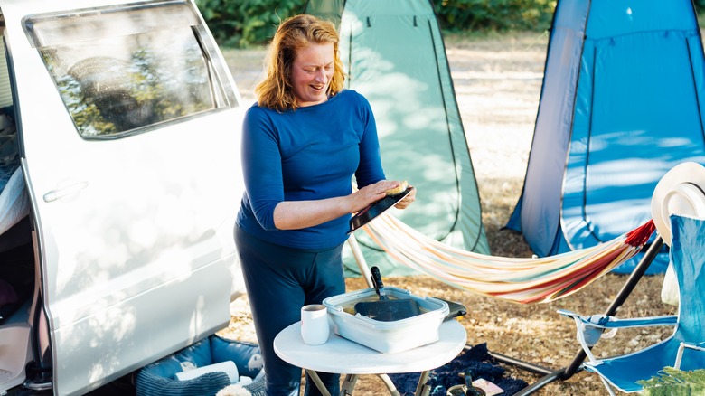 Whether or not you like cooking while camping, cleaning up after is an annoying part of the process. Doing dishes at home is already a little annoying and time-consuming, even with proper tools, running water, and a dishwasher. If you take away all of those conveniences, doing dishes is somewhat complicated. When camping for a day or two, rustic dishwashing is tolerable. But for the long-term, it's frustrating trying to balance your fresh water usage and keeping everything clean. Having a proper sink would be nice, but it isn't very feasible.