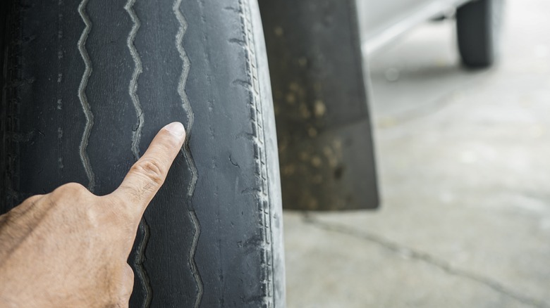 You can check the tread for wear and tear by using a simple trick with a penny. Turn Abe Lincoln's head upside down and stick the penny in the ribs of the treads. If the top of Abe's head is hidden, your treads are good. If you can see the top of Abe's head, the tread is too low and it's time to replace your tires. You also want to check for areas where there might be leaks or punctures. You could easily have your mechanic do this. They might be able to get a better idea of potential damage when the car is lifted.