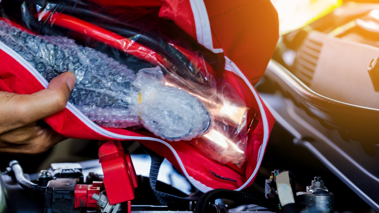 An emergency car kit should always include flashlights, jumper cables, reflective warning triangles, a multitool, fire extinguisher, antifreeze, engine coolant, tire jack, spare tire, duct tape, bungee cords, cable ties, ponchos or umbrellas, and a combo window-hammer and seatbelt cutter. All of these essential emergency supplies cover situations you might face on a long road trip, such as flat tires, battery failure, broken car parts, and being stuck in your car.