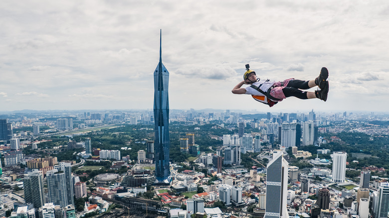 An acronym for buildings, antenna, spans, and earth, BASE jumping involves jumping from a great height and not deploying your parachute until the last possible moment. Admittedly, jumping from a height, whether it's a skyscraper, cliffside, or a cellphone tower, is going to make your heart race with thrilling anticipation. The security of the parachute makes things a little safer, but there is still plenty that could go wrong.