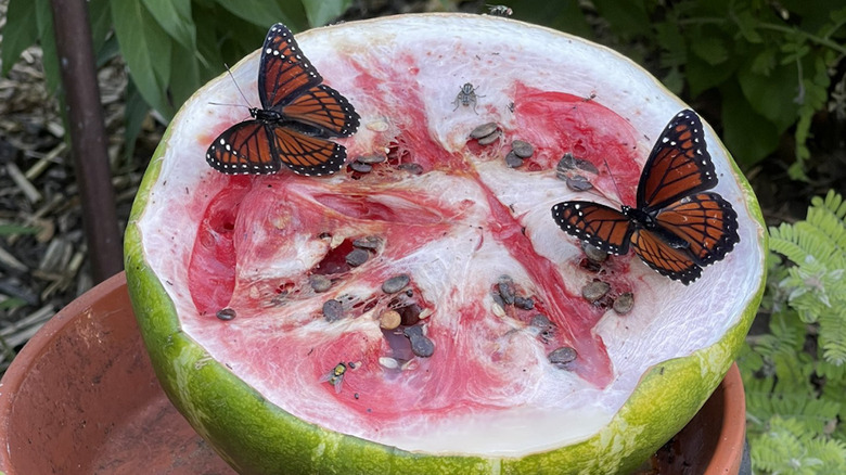 But, what if you have already planted your flowers and want to do something to attract more butterflies? In that case, the answer is watermelon. In fact, butterflies — including the red-spotted purple butterfly, monarchs, and painted ladies — love landing on pieces of bright pink watermelon in order to drink some refreshingly sweet juice. This is also a good way to use up your overly ripe fruits because the sweeter and riper the watermelon is, the more the butterflies will love it. However, before you go ahead and put an assortment of watermelons in your yard, there are a few things you should know so that you don't accidentally attract unwanted scavengers instead of butterflies.