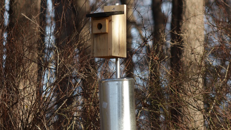If you have a bird box sitting on a pole, a baffle works great at keeping snakes and other potential predators from getting to the nest inside. A galvanized stove pipe or a smooth vent duct are great options, as explained by the Ohio Bluebird Society. You want metal over other materials because it's smooth and difficult for rodents to chew through.