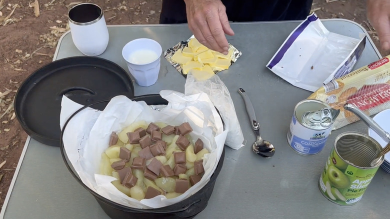 While the name doesn't necessarily sound delicious, we can assure you that the caramel apple dump cake is the perfect camping dessert — especially because it requires only a few ingredients and is easy to make. In fact, "dump cakes" are used to describe cobbler-style desserts where you just dump all the ingredients (including dry cake mix) into a pot and let it all cook together without having to worry about premixing anything. This makes dump cakes a great choice for camping when you may not have access to running water to clean mixing bowls.