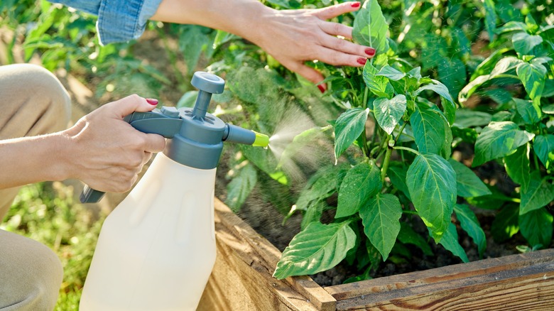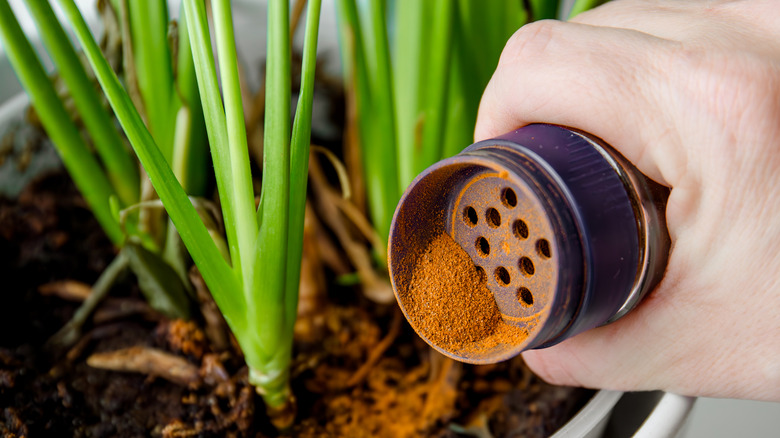 The more complex method involves making a cinnamon spray. An easy way to do this is to mix cinnamon and water with a ratio of a half teaspoon of cinnamon per cup of water. Stir the mixture and allow it to sit overnight. Strain out any undiluted cinnamon so as to not clog the sprayer. Add a couple drops of rubbing alcohol as well as a few drops of liquid dish soap, which will help it adhere to the leaves of the plants. Place the concoction in a sprayer and mist the leaves of all the plants in your garden.